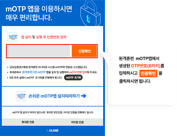 STEP 03 원격훈련 mOTP앱에서 생성된 OPT번호(6자리)인증화면에 입력합니다.